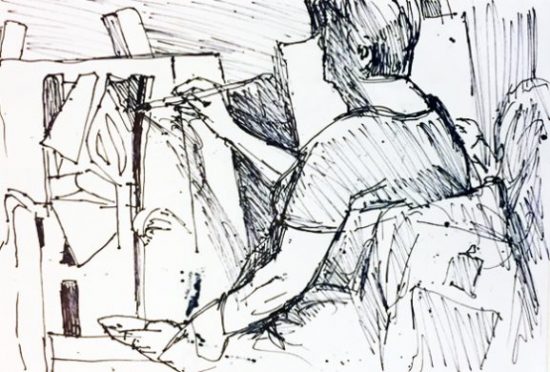 Danke, Babsi! Bei der letzten Zeichnung – der Frau, die grad an ihrem Bild pinselt – ist mein Stift überhaupt nicht geflogen,sondern ich brauchte Geduld, musste warten, bis sie ihre Farbe angerührt hatte und erneut den Pinsel aufs Bild setzte. Denn ich wollte genau ihre Hand mit dem Pinsel erfassen. Zum Glück ist es eine sehr ruhige, systematisch arbeitende Frau, deren Position sich nicht änderte