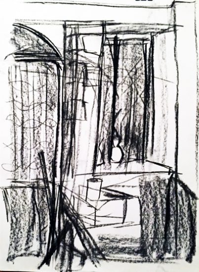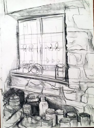 Hier nun zuerst eine Atelierfenster-Kohlezeichnung als Spaziergang: da wandert das Auge gemächlich über die Steine der Wand, die Vasen und Töpfe auf dem Tisch, blickt auch flüchtig aufs Fenstergitter und geht der Raumperspektive nach.