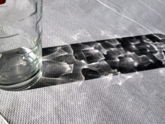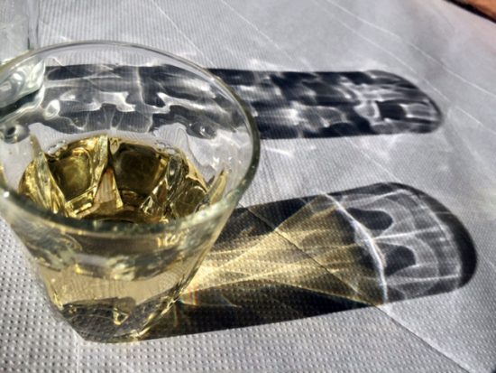Auf dem leicht genoppten Papier-Tischtuch der Taverne spiele ich immer gern mit den einfachen Wasser- und Weingläsern. Herrliche Lichtmuster ergeben sich da. Und ich fragte mich: warum sind die Schatten eines durchscheinenden Glases so dunkel?