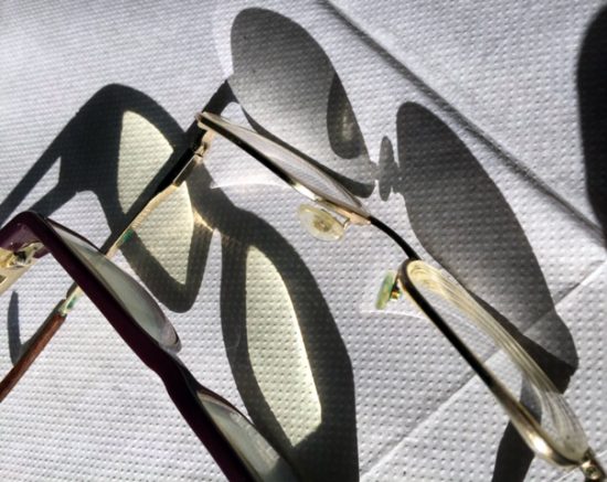 Heute fiel mir auch als merkwürdig auf, dass die Schatten unserer Lesebrillen so verschieden aussehen: Wieso wird das Licht durch meine Brillengläser hell und gelblich auf das Tischtuch geworfen, durch die meines Mannes aber kommt es gebrochen grau? Wir haben beide unsere Brillen nicht tönen lassen, sondern haben ganz gewöhnliche Gläser. Dachten wir.