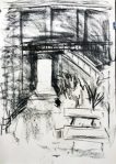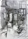 Eine große graue Pappe ist wertvoll, auch oder gerade mit einer ausgewischten Zeichnung darauf. Ich entschloss mich, darüber einen anderen Ausgang zu zeichnen: den meines Ateliers.