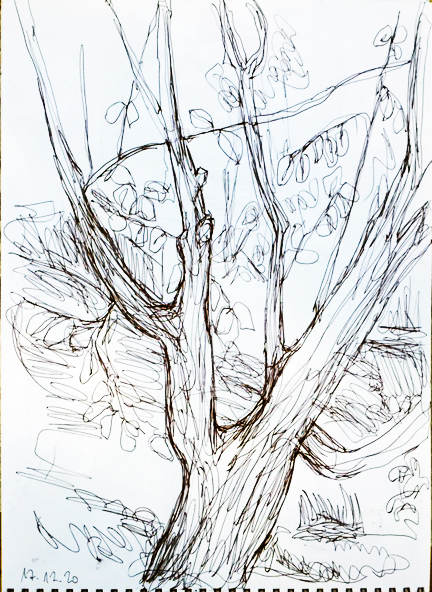 Heute habe ich Ähnliches, aber auf ganz andere Art versucht. Ich zeichnete einen Hibiskus im Topf und den Aprikosenbaum, ohne den Stift abzusetzen. Dies ist eine Technik, die die Aufmerksamkeit stark auf die Kontur lenkt. Sie wirkt zugleich meditativ, da man sich zeichnend auf den nirgends und niemals unterbrochenen Zusammenhang der Welt einstimmen kann.