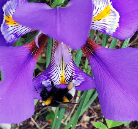 Wilde Bienen sah ich viele an unserem Rosmarin im Garten, aber Hummeln? Und doch: heute auf einem feuchten Berghang – ich war bei Freunden zum Sonnwendfeuer eingeladen – sah ich voller Freude meine erste wilde Iris des Jahres, an der sich eine Hummel tummelte. Sie flog dann weiter zu anderen dort erblühten Iris.