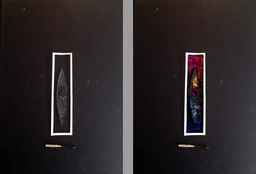 Mir gefällt die Glassplitterflamme in beiden Versionen, während das Streichholz bereits abgebrannt ist. Tolle Idee.