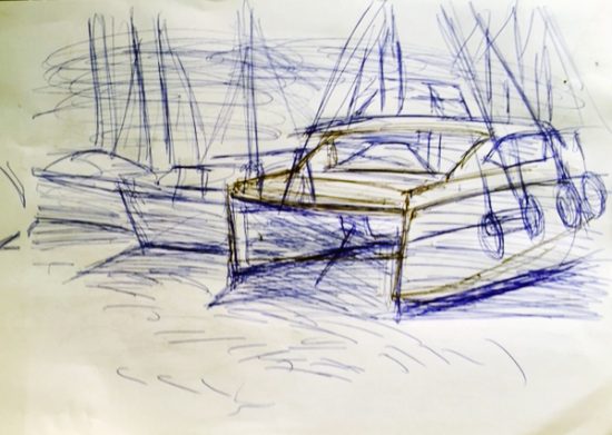 Aber zwei Skizzen machte ich doch, auf der Vorder- und Rückseite des Schreibmaschinenpapiers, das ich zum Glück dabei hatte. Der schwarze Kugelschreiber ging mir aus, also zeichnete ich mit Blau weiter.