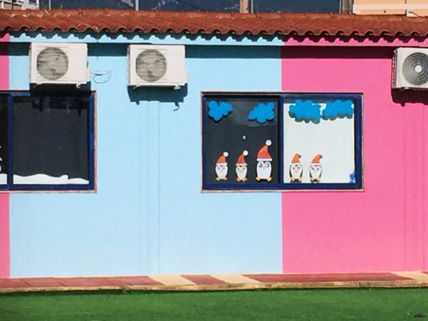 Anfangs war es gar nicht leicht für mich zu erraten, was den kleinen Kerl interessieren könnte. So machte ich ihn auf eine lustige Bemalung in einem Kindergarten aufmerksam: Eulen mit Weihnachtsmann-Mützen und darüber Wölkchen wie blaue Schafe .