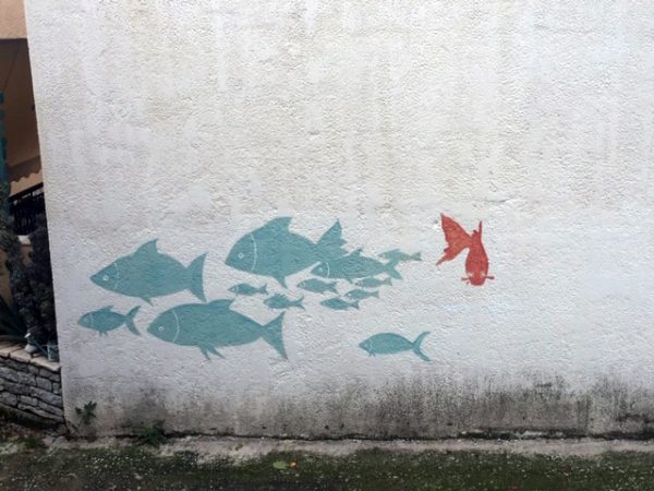 Nicht anders erging es mir heute: ich wies ihn auf eine Wandbemalunug mit einer Flotille hellblauer Fische und einem roten Außenseiter  hin, dachte, es könnte ihn amüsieren.