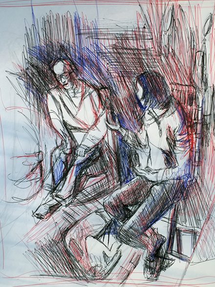 Ich kenne Eleftheria („Freiheit“) schon lange. Sie ist die Leiterin des Behindertenprojekts, von dem ich immer mal wieder erzählt habe. Hier sieht man sie (rechts) auf einer Zeichnung von vor einem Jahr, 11.1.2020.