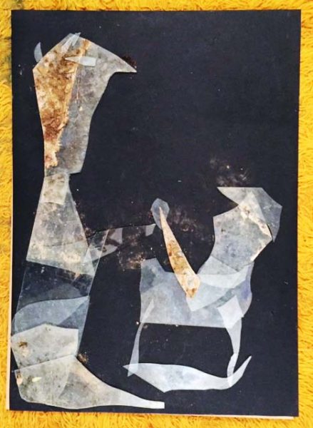 „Wiegenlied“. Gerahmtes Legebild aus Scherben, die ich aus dem Garten aufgeklaubt habe. 15.1.2021