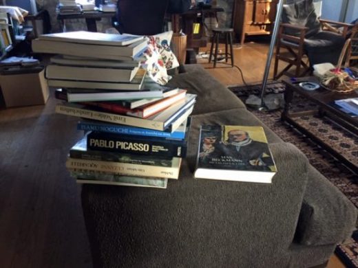 Ein Teil der inspizierten und entstaubten Kunstbücher des kleinen Regals, auf der Sofaecke gestapelt