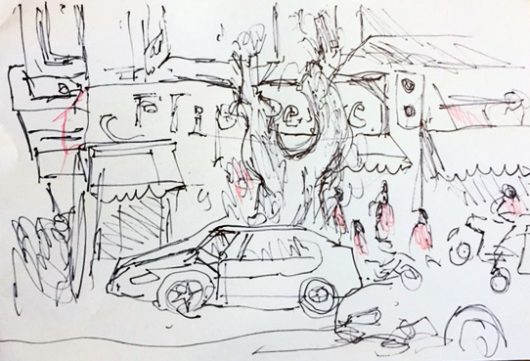 Nun bin ich echt gespannt, was Will.i damit anfangen wird. Heute hat er nur das Rot rausgeholt und ein bisschen in meiner Skizze rumgekritzelt. „Die Männer haben rote Jacken an“, sagte er, und er hat recht. Es sind die Jungs vom Cafe, die mit ihren Mofas die Bestellungen der Kunden besorgen. Solche Bringerdienste haben momentan, da sonst alles geschlossen ist, enorme Wachstumsraten.