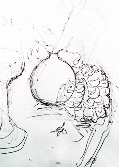 Nächtliches Zeichnen: Pinienzapfen und runde Vase