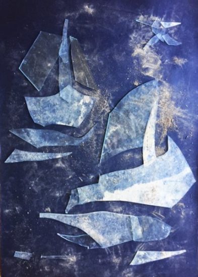 Danke für deine Aufklärung. Ja, das Blau verschwindet, wenn andie Stelle des Himmels eine gelbstichige Lampe tritt. Beim ersten Foto habe ich das Scherbenbild nah an den Ateliereingang geschoben, damit es genug Tageslicht hat, und da spielt dann auch das Blau hinein. Ich will das Bild morgen Mittag noch mal – sofern wir haben – indie pralle Sonne legen und überprüfen, wie es dann aussieht.