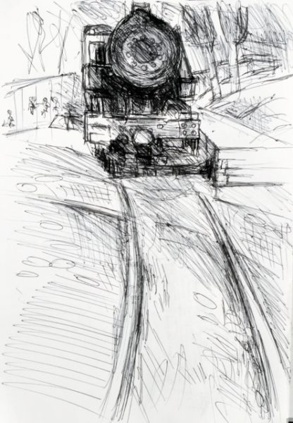 Ich setzte mich auf eine Draisine, vor mir ein leicht in den Boden eingesunkenes Gleis und eine dicke fette schwarze Lok, an der, versteckt hinter der dickleibigen Maschine, eine Reihe von Güterwaggons hing. Ich überlegte, wie nah oder fern ich die Lok auf dem Papier platzieren sollte … Tatsächlich zoomt man beim Zeichnen ähnlich wie mit dem Fotoapparat, indem man sich auf einen „Ausschnitt“ der Wirklichkeit konzentriert. So rückt der Gegenstand je nach Interesse nah heran, weiter weg oder verschwimmt zu einem diffusen Punkt am Horizont. In diesem Fall wählte ich eine mittlere Entfernung, die einerseits dem Zug Schwung gibt, als führe er gleich los, andererseits die Details noch erkennbar bleiben.