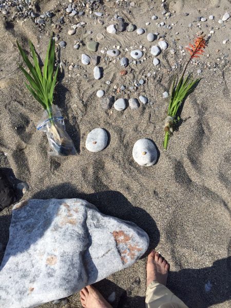 Nach langem schönem Spaziergang durch eine kraftstrotzende Natur, die gar nicht weiß, was sie zuerst hervorbringen soll – wilden Rokka, riesenhafte weißlich gemaserte Artischockenblätter, Storchenschnabel mit kleinen rötlichen Blüten, Asphodelen wohin man schaut, wilden Spargel mit feinen essbaren Trieben, feine blaue Perlblumen mit Knöllchen, die man sammeln und in Essig einlegen kann, Löwenzahn, grüne Wiesen mit kleinen Margariten und gelbem Klee unter den alten Ölbäumen, an schattigen Hängen blaue Iris mit wunderbarer fedriger Zeichnung, leuchtend rote Anemonen, ausgewilderte orange Gladiolen und weiße elegante Calla … unter leicht bewölktem blauen Frühlingshimmel …. gelangen wir an den Strand. Ziehen die Schuhe aus, legen uns in den feinen weißen Sand und schließen die Augen, um auf das Meer zu lauschen.