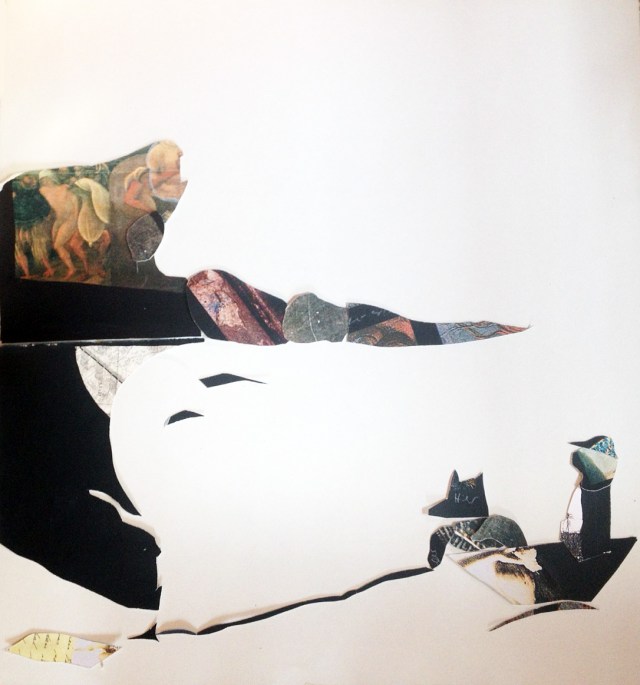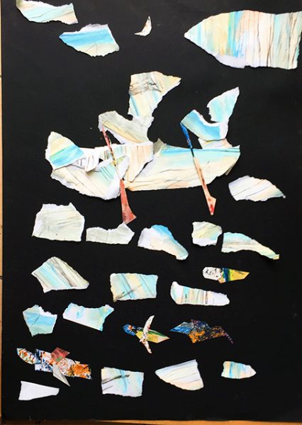 Natürlich habe ich viele Bilder mit Booten gemacht. Heute legte ich aus grob gerissenen Schnipseln eine neue Szene. Still zieht das Ruderboot durch die Abenddämmerung. Ein Sichelmond zeigt sich zwischen dem farbigen Gewölk. Ich höre nur das leise rhythmische Klatschen und Platschen der Ruder, die ins Wasser tauchen. Manchmal dringt der Ruf eines Nachtvogels an mein Ohr. Die Fische streben lautlos ihren Schlafplätzen zu. Verzaubert ist die Welt.