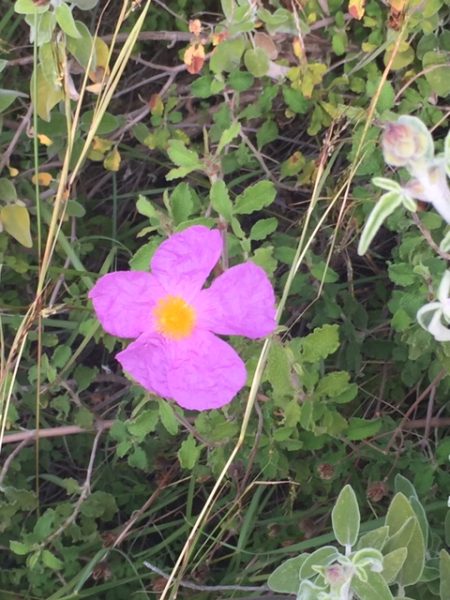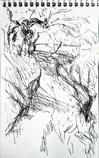 Wenn ich solche Wege gehe, kommt mir stets die Rilkezeile in den Sinn „Wege gehen weit ins Land und zeigens“. Ich bleibe stehen, betrachte den Weg mit seiner lehmigen Bruchkante, den Gänseblümchen und dem Grünzeug, zücke meinen winzigen „Reporterblock“ und skizziere den Weg mitsamt den Olivenbäumen, die auf verschiedenen Höhen des steil abfallenden Geländes wachsen, In der Ferne die Horizontlinie des Meeres.