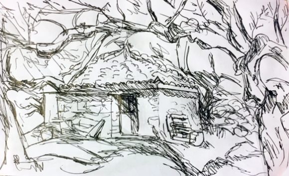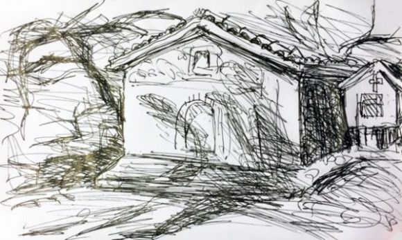 Außer drei Villen, die durch breite Einfahrten und bellende Hunde den Eindruck der Unbewohntheit nicht übertünchen konnten, sah ich da oben nichts als Felsen und Oliven. na ja, auch noch andere Pflanzen natürlich – blühende Wolfsmilch, Ginster, Diesteln, Arnika, Gänseblümchen, dann und wann auch einen Feigenbaum, der erste Blätter trieb. Ein Kirchlein und daneben ein altes Haus fanden sich auch. Und so setzte ich mich auf einen Felsen und zeichnete beide: das alte Bauernhaus umgeben von den Oliven, und die kleine Kirche, die einen zwingt, sich sehr tief zu verbeugen, wenn man durch die niedrige Tür eintreten will. Die Wände werden unter dem Licht- und Schattenspiel der Ölbäume lebendig.