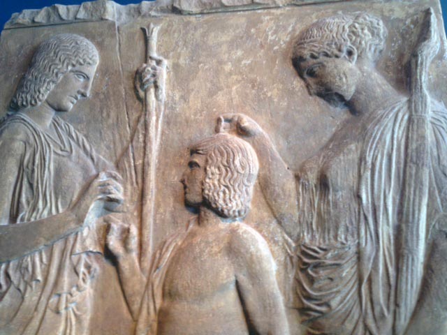 Demeter und Persephone, zwischen ihnen Triptolemos, der die Ähren empfängt. (Kopie des Originalreliefs, eigenes Foto)