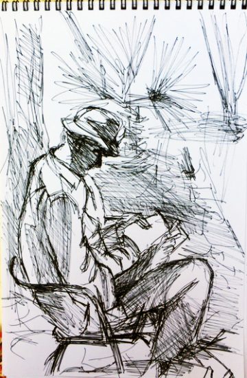 Erinnert wurde ich auch an Cezannes „Kartenspieler“, über die ich mal in einem Blogeintrag (hier) schrieb. Anlass waren nicht nur der etwas zu kleine Kopf und der lange Oberkörper, sondern vor allem der Hut. Und so gefällt mir meine heutige Skizze, obgleich sie weder richtig noch dem Modell ähnlich ist. Dafür aber enthält sie Anspielungen auf einige der schönsten Gemälde des 19. Jahrhunderts – ganz abgesehen von dem Genuss, da draußen auf der Treppe zu sitzen und meinem Mann beim Lesen zuzuschauen.