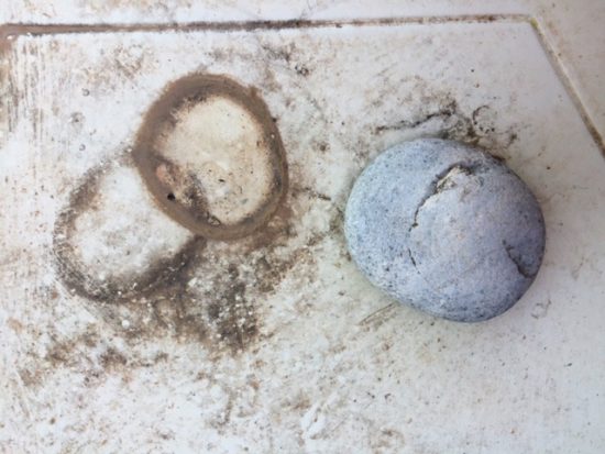 Sonst nichts? O doch! Zwei Entdeckungen – im Wortsinn. Erst deckte ich ein Wüstensandgemälde auf einem Gartentisch auf.  Steine, die dort lagerten, hatten den Sand um sich geschart und Kreise gemalt. Und dann:  ein Loch im Sitzkissen! Nanu? Ja, das Kissen hatte jemand vor den Eingang des Holzbienen-Domizils gestellt. Am andern Morgen nahm ich das Kissen weg und sah…. Ich hoffe, die Brut ist dennoch wohlauf. Tut mir echt leid, ihr Lieben.