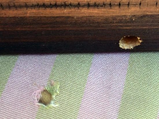 Die HOLZBIENEN HABEN SICH VON INNEN (Holz) NACH AUSSEN (Stoffkissen) GEGRABEN – GANZ DURCH SIND SIE NICHT GEKOMMEN: DRUM MACHE ICH MIR AUCH SORGEN: Leben sie? Sind sie zu Schaden gekommen? Das Kissen ist leicht und recht dünn, aber als ich es bemerkte und von der Bank entfernte, war das Loch im Stoff nur auf der dem Holz zugewandten Seite.