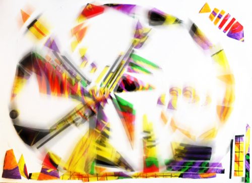 Ein leichtes Erzittern zuerst, dann beginnt sie sich zu drehen. Die Einzelformen verschwimmen, löschen sich gegenseitig aus. Nur der Fisch am oberen Rand entzieht sich dem Wirbel.