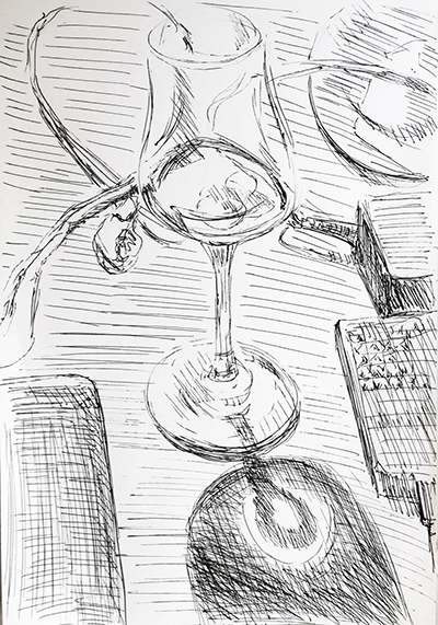 Kabel, überall Kabel. Lampen, Computer, Drucker, Lautsprecher, Radio, WLAN, Fernseher, Mikrophone, Aufladegerät, Staubsauger, Föhn … ich hör ja schon auf. Auf dem Tisch, unter dem Tisch: Kabelsalat. Ein Kabel, über das man leicht stolpert, ist mit einem weißen Papierfetzen markiert: Vorsicht, Kabel! Manchmal balanzieren grüne Wanzen auf dem Computer-Kabel, dann fotografiere ich es. Manchmal zeichne ich auch Stillleben mit Kabel – weil es eben da ist. Es ist halt überall. Wie hier hinter dem Weinglas.