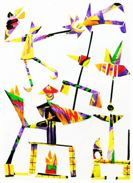 Ich sehe zwei Feuerstellen. Die eine mit Feuer und einem kräftigen Spieler, der in seiner linken Hand mit einem Stab zwei Figuren dirigiert. Ein Erstklässerkind mit Schultüte und eine Mutter, die ihre Ohnmacht zu Fall gebracht hat. Mit dem rechten Fuß kickt der Spieler eine Schultüte ins Aus. Vielleicht gehört sie zu einem Kind, das nicht zur Schule gehen darf, weil es nicht an die Regeln angepasst ist. In der zweiten Feuerstelle brennt kein Feuer. Eine sehr schlanke Frau balanciert auf ihrem Kopf einen Stab mit einem Vogel. Von dem Spieler scheint der Vogel unbeeinflusst zu sein. Durch den Stab ist aber auch er nicht ganz frei. Die Frau steht in lockerer Verbindung mit dem Spieler, als wolle sie die Waage halten, erscheint dafür aber viel zu schwach. Auch auf dem Stab des Spielers sehe ich ein Waagesymbol. Es neigt sich bedenklich in Richtung der Frau.