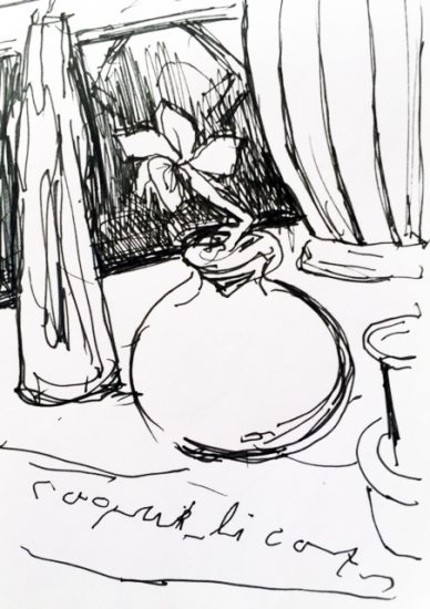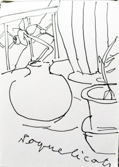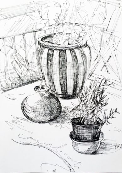 Die Zeichnung vom Pflanzen-Sammelsurium auf dem Balkontisch gefällt mir noch besser als das Foto dazu. Zum Studieren ist auch die erste Skizze sehr interessant, weil sie einfach aussieht und gleichzeitig sehr lebendig und schwungvoll ist.