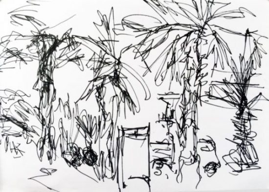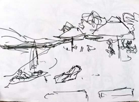 Viel habe ich nicht gezeichnet, seit ich wieder in Athen bin. Anderes stand an. Aber ab und an fand sich doch ein Kugelschreiber und ein Block, so gestern, als wir in einem Cafe am Strand von Kalamos saßen und einen Kaffee tranken. Was auf dieser Skizze drauf ist, brauche ich wohl nicht zu erklären: ein zusammengeklappter und zwei offene Sonnenschirme, letztere zu einem anderen Cafe gehörend, darunter ein paar Leute, dahinter ein paar Bäume, vorne links eine Schöne auf einer Liege und eine leere Klappliege, noch weiter links ein Stück Meer und die Kulisse der Halbinsel Euböa. Und ganz vorne? Zwei Rückenlehnen von Kaffeehausstühlen. Alles klar? Sieht man doch, oder?