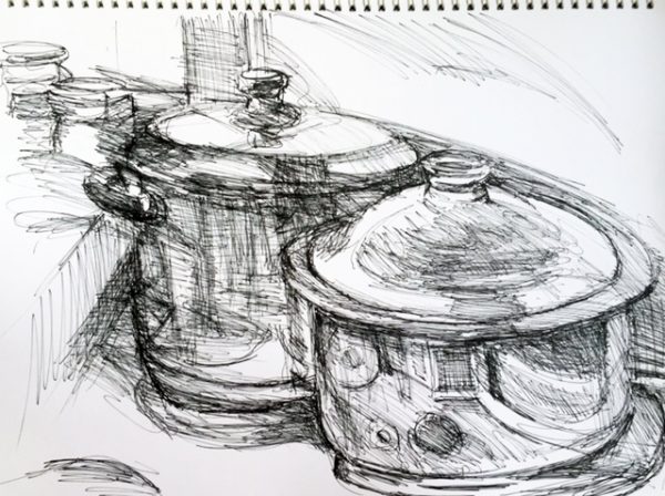Ich bin ein ungeduldiger Mensch und daher eine schlechte Köchin. Es scheint mir verlorene Zeit, so wie heute eine dreiviertel Stunde aufzupassen, dass die Artischocken a la Polita nicht anbrennen. Um der Warterei einen Sinn zu geben, fing ich an, die Kochtöpfe zu zeichnen. Gar nicht so einfach! Zwei Zeichnungen machte ich auf einem sehr kleinen Block.