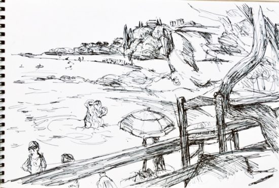 Mittags machten wir uns auf den Weg zur idyllischen Fischtaverne Babis, wo auch Asteria zu Hause ist, von der ich im vorigen Blogbeitrag erzählte. Hier zeichneten wir uns gegenseitig. Ich machte dann noch eine zweite Skizze vom Meer mit den Badenden. Die vor Ort gemachten Fotos der Zeichnungen sind stark blaustichig und wie schon Asterias Bilder mit Sonnentalern bedeckt.