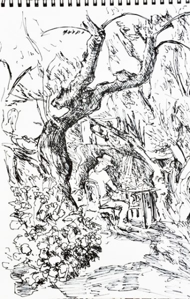 Meine beiden Zeichnungen habe ich dann noch mal zu Hause fotografiert. Die runde Scheibe über Efis Haupt ist KEIN Heiligenschein, sondern eine am Baumstamm befestigte Tischplatte. Zum Vergrößern bitte anklicken.