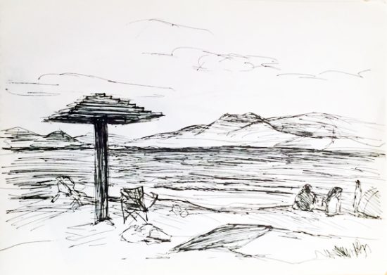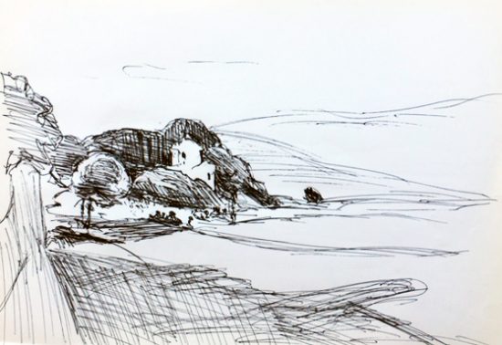 Zwischendurch zeichnete ich noch eine kleine Strandszene. Das Land gegenüber ist übrigens Euböa.
