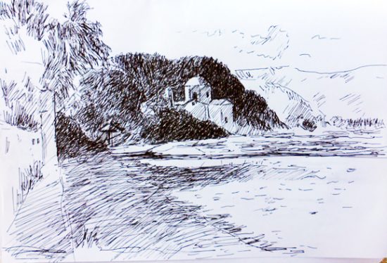 Meine Nachbarin und Freundin Efi – ihr kennt sie schon ein wenig durch unser gemeinsames Zeichnen (hier) – lud mich heute ein, mit ihr und einer anderen Frau an Attikas Westküste zu fahren, um zu schwimmen. Natürlich mussten wir beide auch ein wenig zeichnen. Wir wählten uns ein idyllisch gelegenes weißes Kirchlein als Motiv.