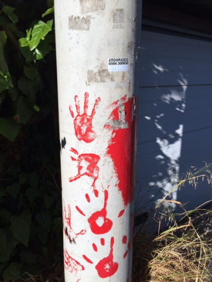 Ein Lichtmast ist zwar keine Höhle, aber der Wunsch, die eigene Hand als Abdruck zu verewigen, ist heute wohl genauso stark wie zu Beginn der menschlichen Kunstäußerung.  Überall auf der Erde gibt es sie: in Indonesien fand man wohl die ältesten (mehr als 40 000 Jahre, lese ich), nicht viel jünger sind die in Afrika und Europa, und auch in Südamerika entstanden sie lange vor den Zeiten, als Europäer den Kontinent berührten.