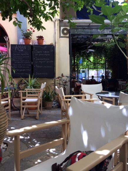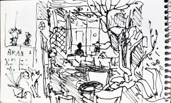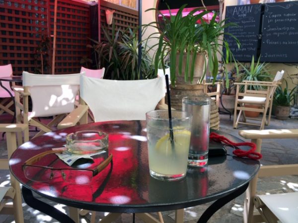 An einem dieser Tage, an denen die Sonne ohne jede Milderung durch Wolken auf die hitzegeplagte Menschheit niederstrahlt, wurde mir ein kleines Cafe in Kalamata zur höchst willkommenen Oase. Das Licht malt, durch Grün gefiltert, Sonnentaler auf das Tischchen, das Glas, den Boden. Der Zitronensaft ist frisch gepresst und kühl. Ich kann aufatmen und sogar eine Skizze machen, während ich auf meinen Mann warte, der etwas zu erledigen hat.