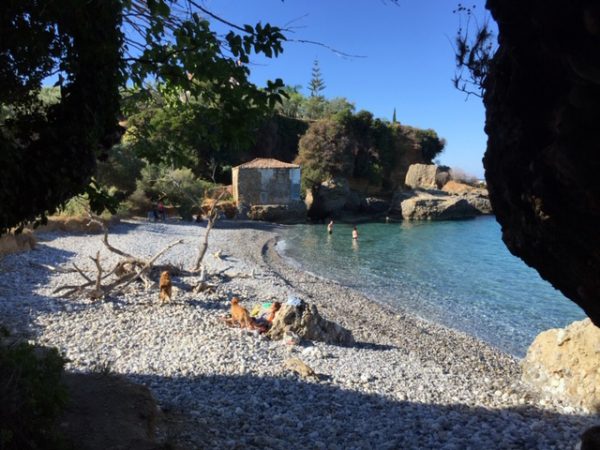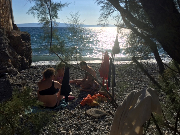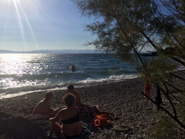 Hier sitzen wir zu fünft im heißen gleißenden Licht, klönen und stürzen uns immer wieder ins herrlich kühlende Meer.