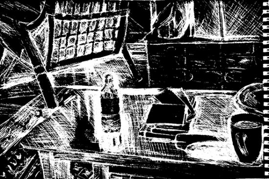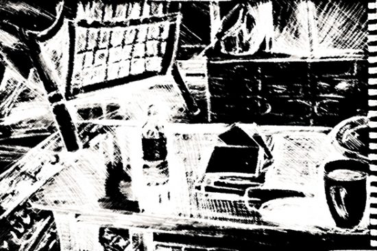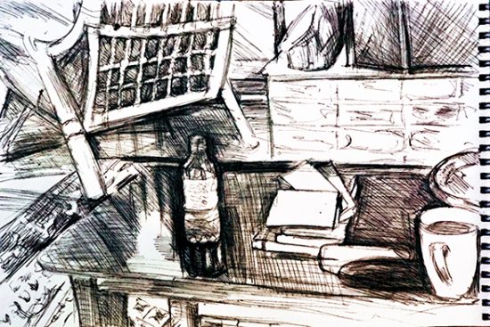 Die letzte Zeichnung (Couchtisch mit Kram, Rohrsessel und Kamin) ist gestern entstanden – nicht wie die anderen im winzigen Reporterbock, sondern in A5 Format. Mit ihr habe ich auch digital herumgespielt und finde die unterschiedlichen Raumwirkungen interessant genug, um sie hier festzuhalten (bitte zum besser Sehen anklicken).