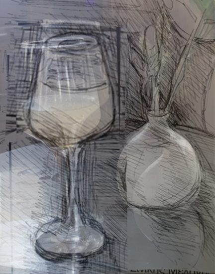 Nun überblendete ich das Dreifach-Foto mit meiner Zeichnung und passte die gezeichnete Vase genau in die fotografierte. Das Weinglas erscheint deutlich als „zu klein“ gezeichnet.