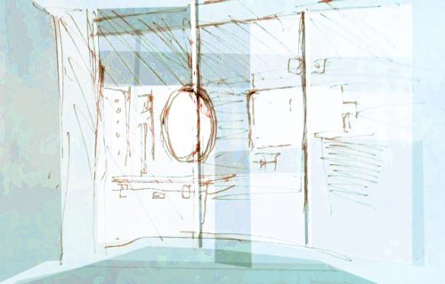 Eine kleine Skizze von einer Glastür, hinter der sich eine Art Schnellimbiss befindet – oder besser befände, befinden wird, befunden hat. Was richtig ist, weiß ich nicht, jedenfalls befindet sich momentan dahinter nichts als spiegelndes Glas, eine spiegelnde Theke, ansonsten Leere. Im Stehen machte ich eine kleine Skizze, denn etwas zog mich daran an. Was? Auch das weiß ich nicht. Vielleicht war es die spiegelnde Leere, das Unbedeutende dieses Eingangs.