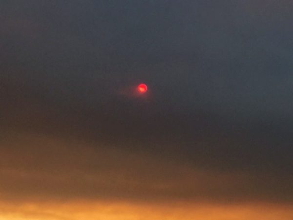 Als die Sonne unter der Rauchwolke hervortaucht, fängt die Luft erneut an zu glühen.
