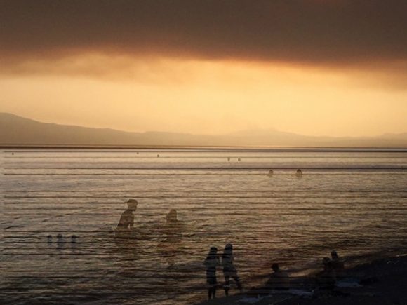 Als ich die Schwimmer im rötlich-trüben Meer sehe, höre ich wieder Musik, eine andere Melodie ist es als am Vortag.. Ich unterlege das Foto wieder mit Notenlinien, Vielleicht kannst du die Musik vernehmen?
