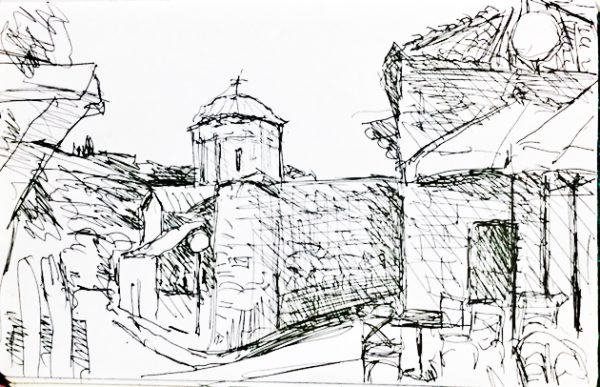 Später, auf dem Dorfplatz sitzend, zeichne ich eine historische Kirche mit leider weitgehend zerstörten Wandbemalungen, die du hier sehen kannst.
