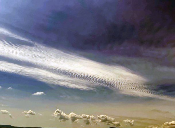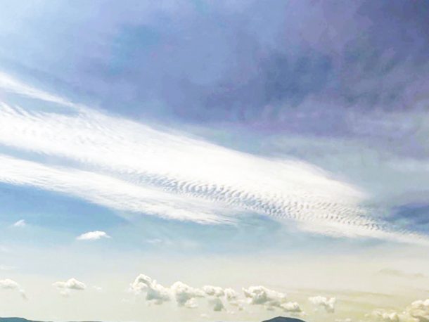 Das ist ein Foto mit phone 5. Ich habe dann dieselbe Wolke noch einmal mit meinem neuen iphone 11 aufgenommen. Der erfasste Bildausschnitt ist viel größer, die Wolkenstruktur nicht erkennbar, stattdessen ballt sich im rechten oberen Eck ein starkes Blau, das ich so nicht gesehen habe.