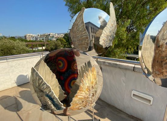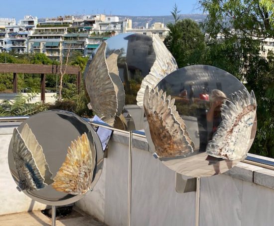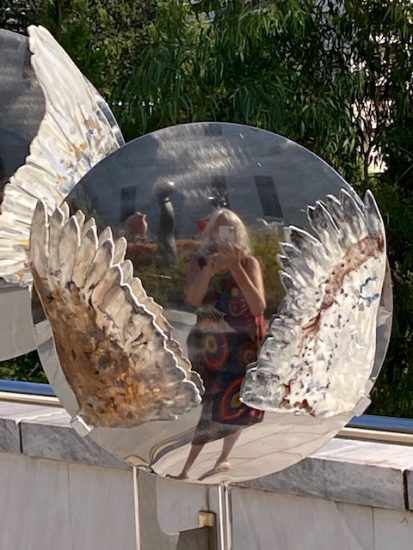 Eine der Skulpturen, die ich im Garten des Byzantinischen Museums sah, machte mir besonderen Eindruck: von Flügeln gehaltene runde metallene Spiegel.