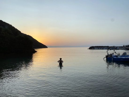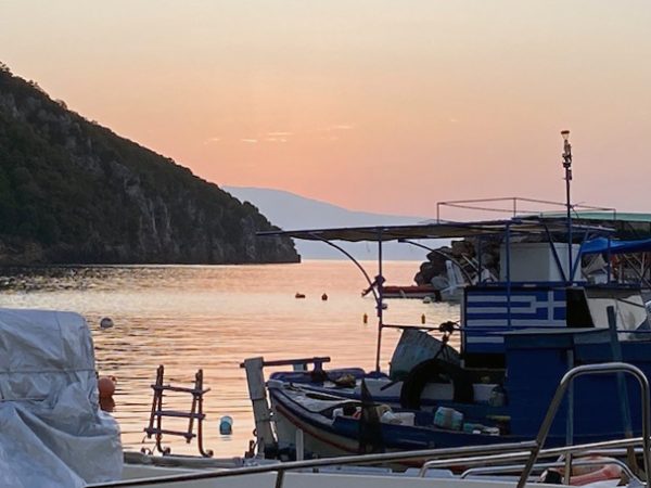 Nun also wieder Mani. Das Haus wurde in unserer Abwesenheit geputzt, das Wasser, das zehn Tage lang abgestellt war, ist wieder da, die Katzen Prinkipissa und Paulinchen sind dank der nachbarlichen Fütterung wohlauf, die Bäume und Sträucher freuen sich, als wir sie gießen, ich springe ins Meer und genieße die sehr entbehrte Frische. Gegen Abend fahre ich mit einer Freundin zum Hafen von Kitries und schwimme weit in den leicht bewegten goldglänzenden Spiegel hinaus. Später sehen wir dem aufgehenden Vollmond zu, genießen in einer Strandbar einen Drink, plaudern mit Bekannten. Das Leben kann schön sein, o ja.