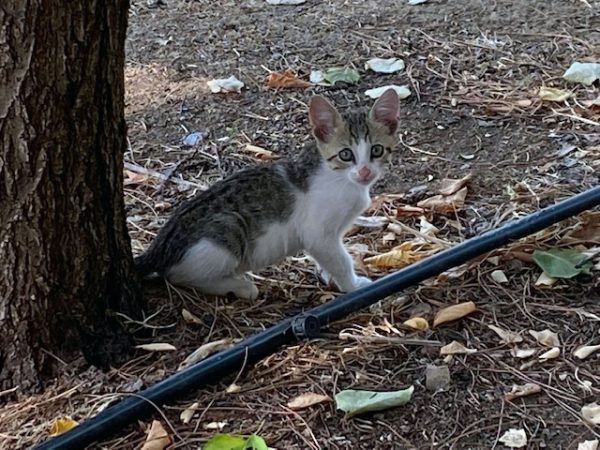 Paulinchen, scheu wie ihre Mutter, spielt mit den herabgefallenen Blättern des Aprikosenbaums.