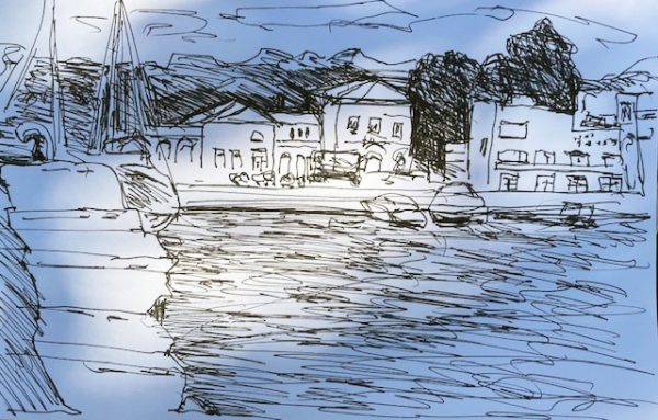 Häuserzeile und Boote am Hafen (tägliches Zeichnen)